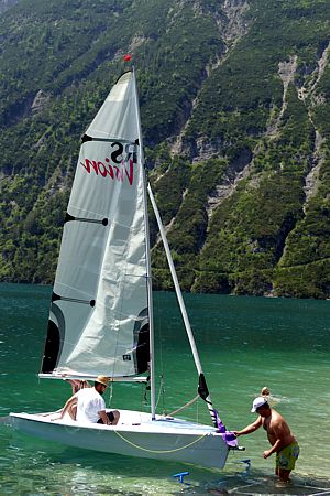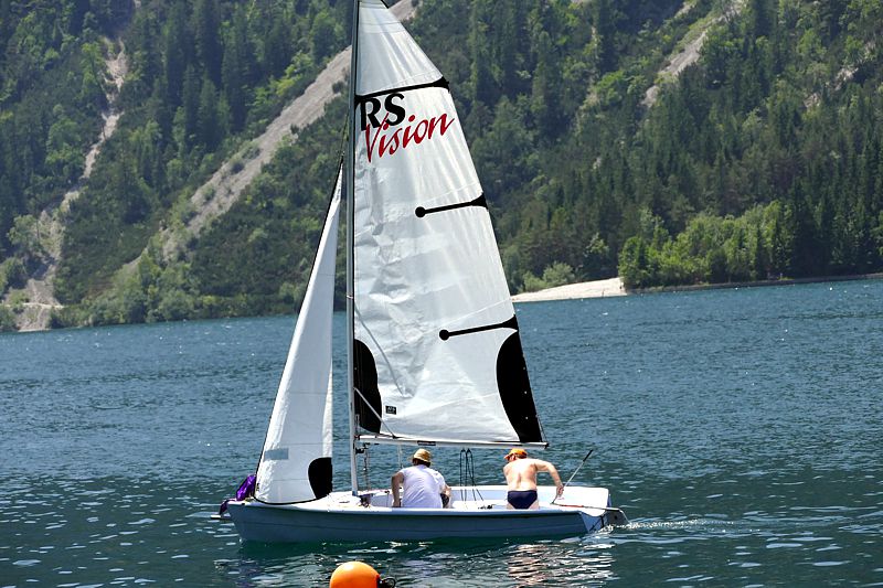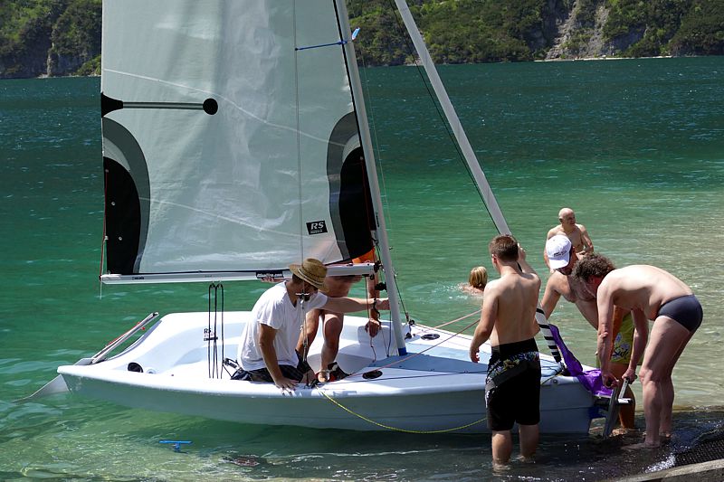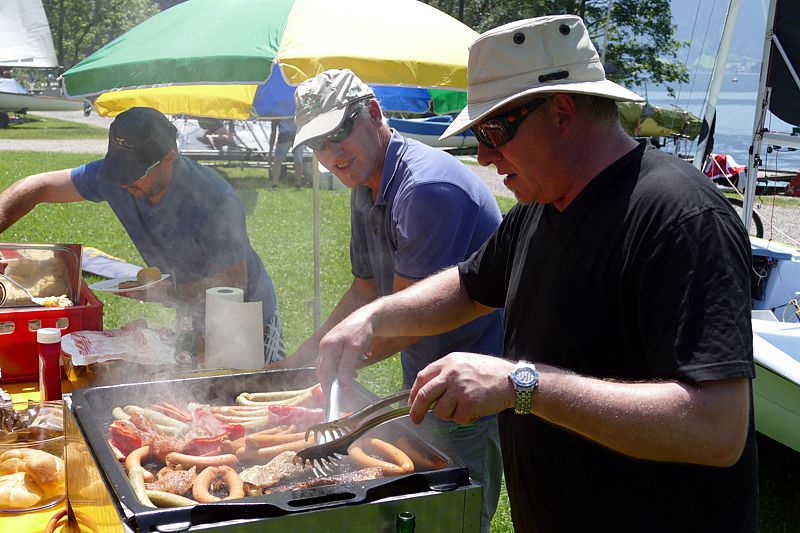 Bei herrlichstem Sommerwetter trafen so um die 30 Z-Crew Mitglieder gegen Mittag am Achensee ein, wo sie schon von einem fleißigen Team erwartet wurden. Es gab professionell zubereitetes Gegrilltes und viel zu trinken – aber wenig Schatten. Nachdem das Interesse am Gegrillten etwas nachgelassen hatte, rückte unsere Achenseeflotte in das Zentrum des Interesses. Besonders die neue RS Vision wurde eifrig ausprobiert – zuerst eher vorsichtig mit Neopren Anzug, später etwas leichtsinnig mit T-Shirt. Obwohl der Boarische zeitweise recht auffrischte, gab es (leider) keine Gelegenheit, beim Aufrichten einer gekenterten RS Vision zuzuschauen. (Fast) alle Segler kamen staubtrocken – oder zumindest nur schweißnass von ihren Schlägen zurück. Und alle waren sich einig in der professionellen Bewertung: „Des isch ganz schia gwarig“.