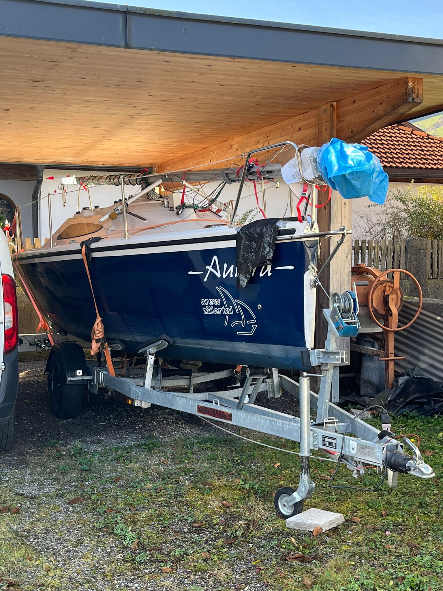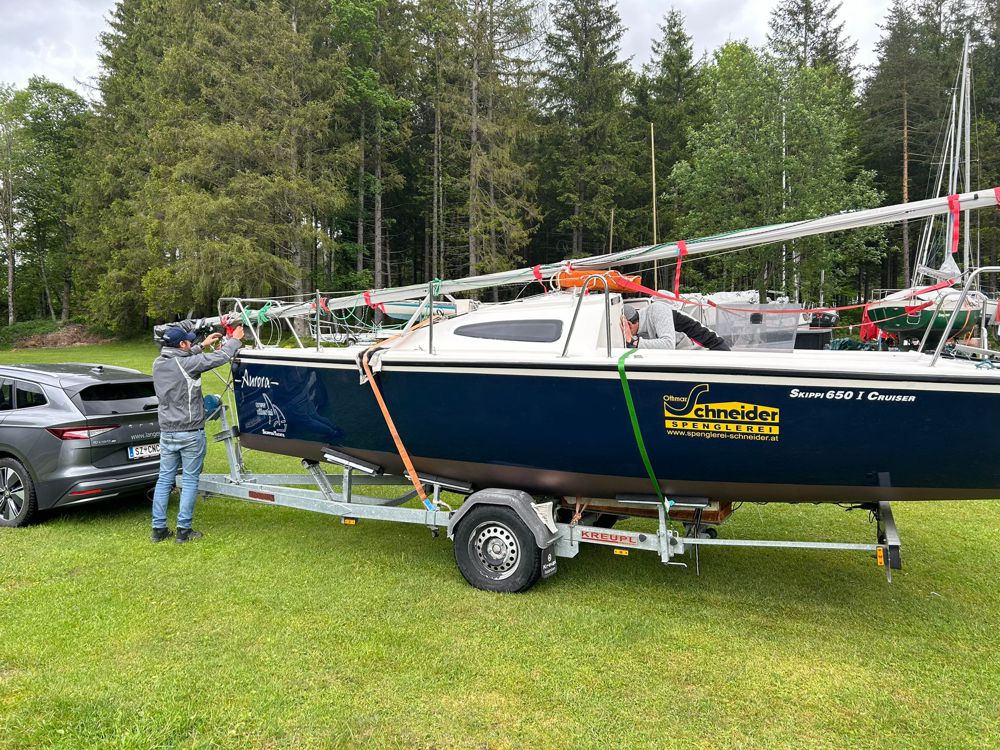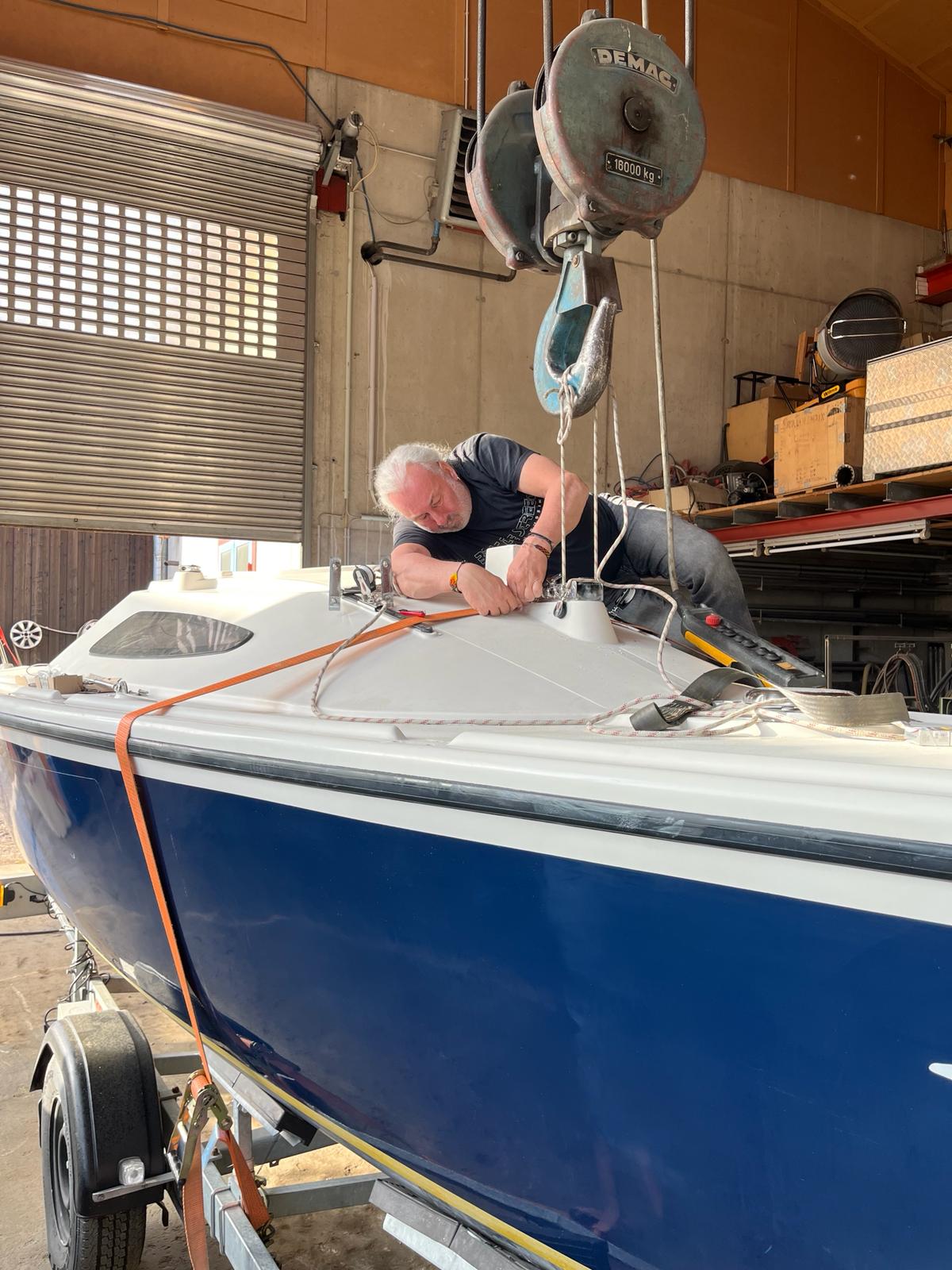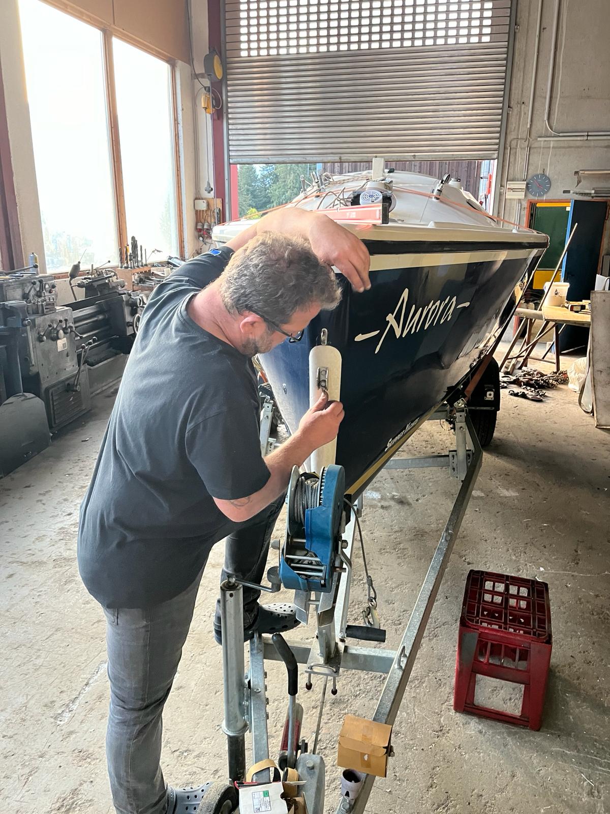 Anfang April holten Hannes und Harry die Skippi aus dem Winterlager bei Hans Langesee ab und brachten sie auf den Stummerberg, wo Hansjörg seine große Werkshalle als Trockendock zur Verfügung stellte. Seither wird unter der fachkundigen Leitung von Harry mit mehr oder weniger Unterstützung durch Clubmitglieder an der Skippi geschraubt, geklebt, geputzt, geschliffen und poliert.