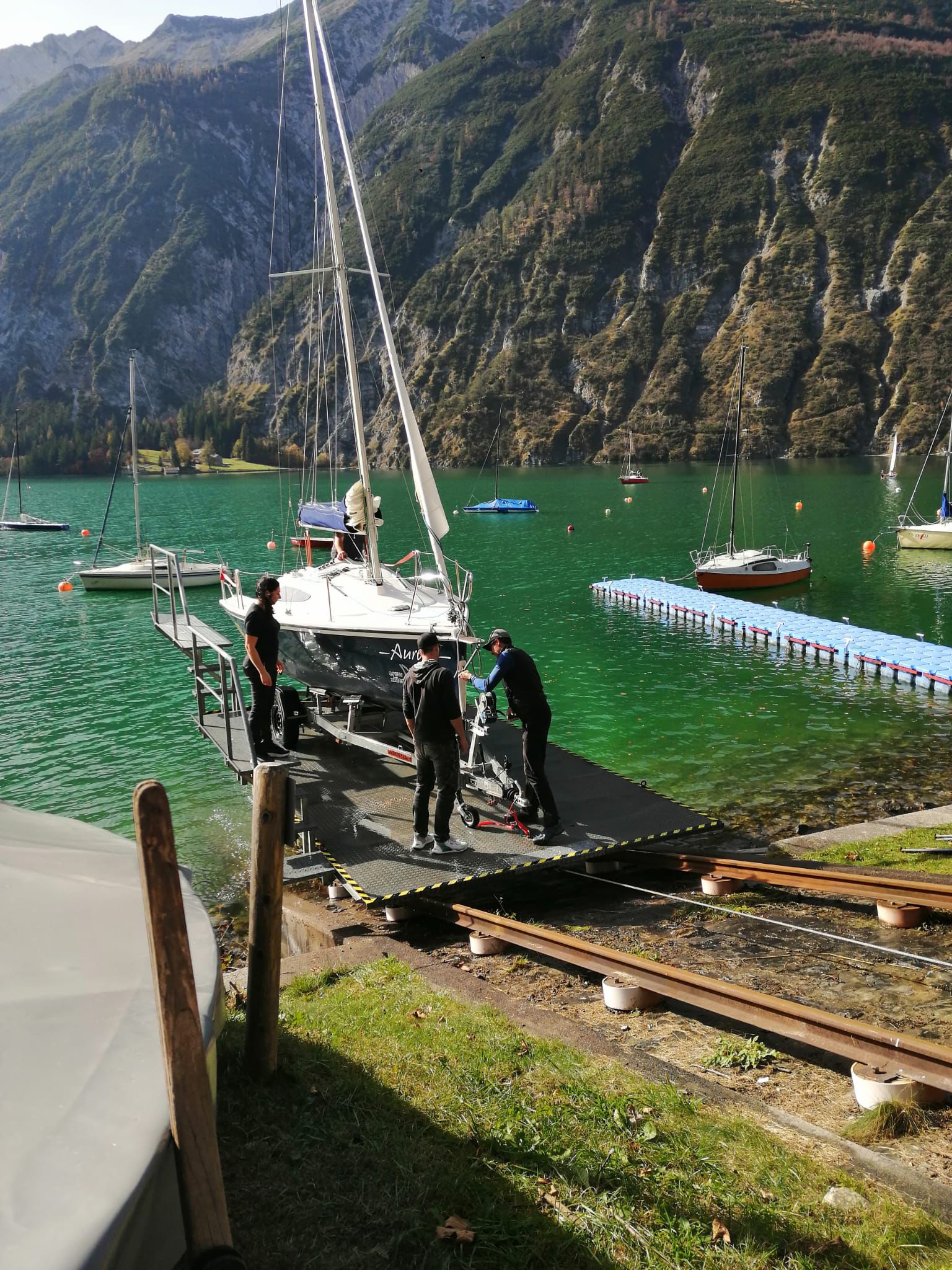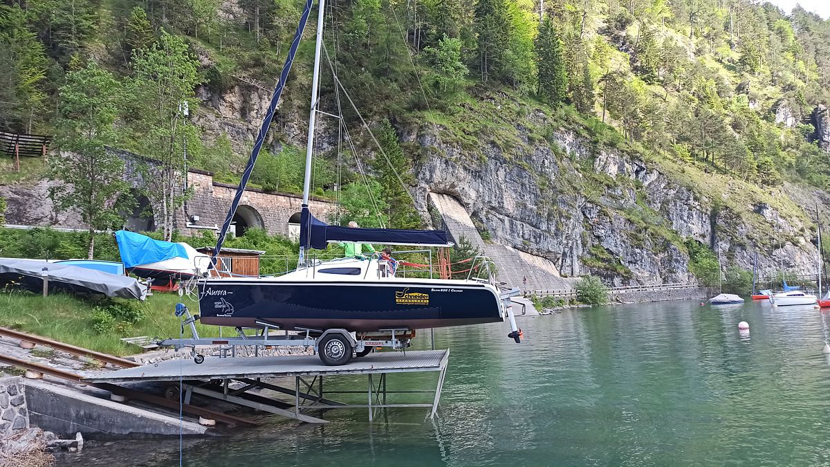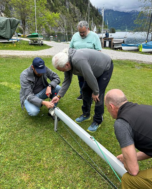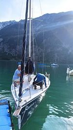 Zu Pfingsten trafen sich einige fleißige Crew Mitglieder am Achensee um unter fachkundiger Anleitung unseres Binnenseereferenten Hans die wie neu glänzende Skippi aufzuriggen. Leider ist uns das Bojenglück nicht hold. Wieder einmal war unsere Boje nicht zu sehen. Die Skippy ist zwar aufgeriggt aber nicht im Wasser. Es wird also notwendig sein, einen Tauchgang an dieser Stelle in den nächsten Tagen durchzuführen um herauszufinden, warum die Boje verschwunden ist. Eine denkbare Möglichkeit ist, dass sie sich bei Niedrigwasser im Winter am Ufer verhängt hat. Ein herzliches Dankeschön an alle, die geholfen haben, die Skippi so gut instand zu setzen und wieder segelfertig aufzuriggen.